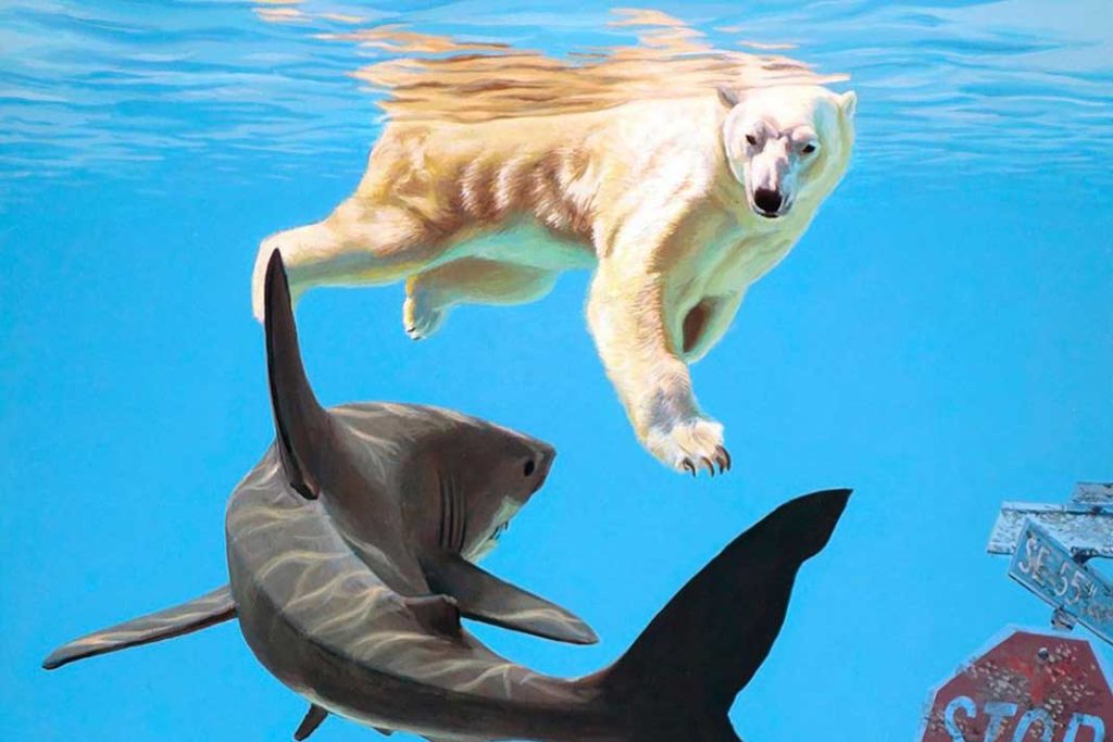 Painter Josh Keyes is very popular in our home. Particularly for his tendency to feature bears in his work, but I also love his clean and bold brush technique. His post-apocalyptic/environmental subject matter helps remind us all that this planet is not going to last forever – particularly at the current rate. We are the proud owners of this print, entitled “The Call”.
